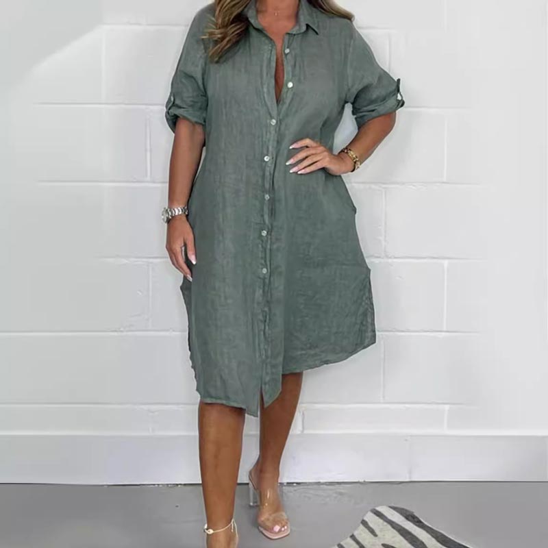 Fabriqué en coton et en lin de haute qualité, cette robe de chemise est légère, respirante et douce contre la peau, assurant un maximum de confort tout au long de la journée.