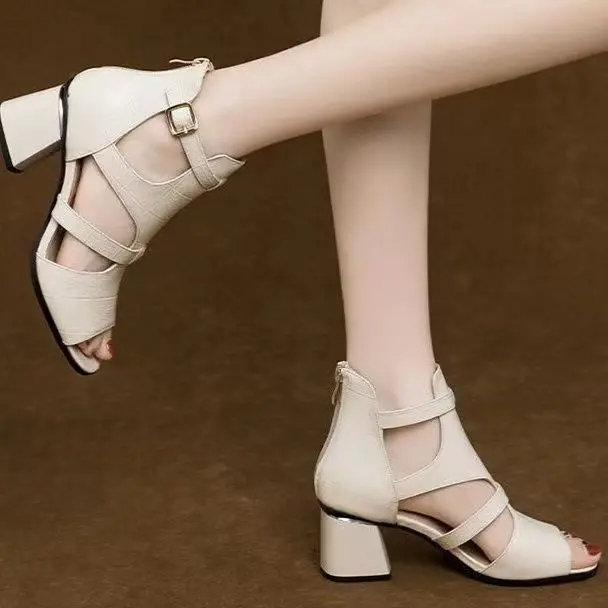 Augmenter la quantité de 👡[35-40] 2024 Sandalias romanas de tacón grueso de suela blanda de cuero suave con boca de pez de tacón abierto