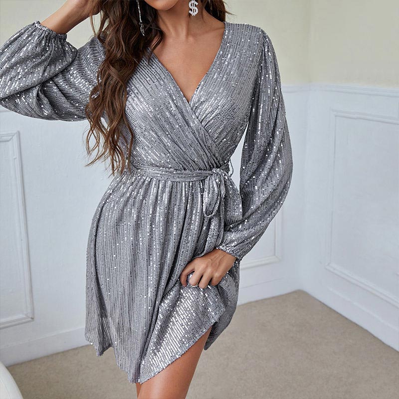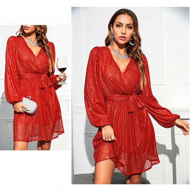 Contenu de l'emballage : 1 * Robe mini élégante à paillettes et col en V avec ceinture pour femme