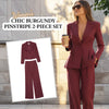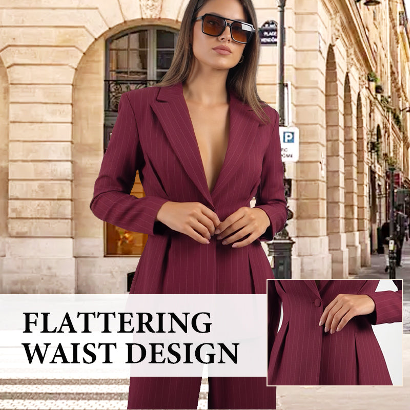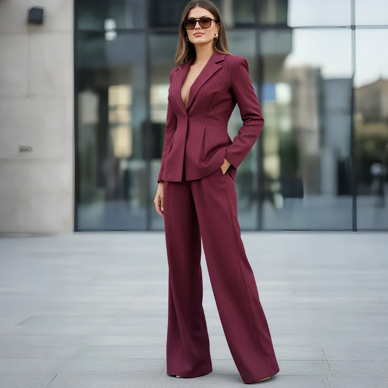 Ensemble 2 pièces chic bordeaux à fines rayures pour femme : blazer cintré à la taille et pantalon à jambes larges