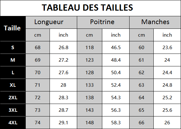Taille : S, M, L, XL, 2XL, 3XL, 4XL